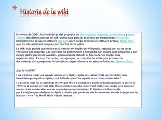 En enero de 2001, Jimmy Wales y Larry Sanger decidieron utilizar un wiki como base para el proyecto de enciclopedia Wikipedia. Originalmente usaron el software UseMod, pero luego crearon Media Wiki, que ha sido adoptado por muchos otros wikis. Un wiki es un espacio colaborativo fácil y rápido de realizar que permite a los participantes trabajar juntos en páginas web para añadir o modificar su contenido.