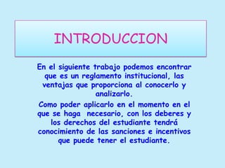 El documento presenta el reglamento institucional de la Universidad Popular del Cesar. El reglamento establece las normas y procedimientos que rigen la conducta de los estudiantes, como los deberes y derechos, así como también las sanciones por faltas como fraude académico o agresión a otros. El reglamento provee una guía para la organización de la institución y la convivencia armónica de la comunidad estudiantil.