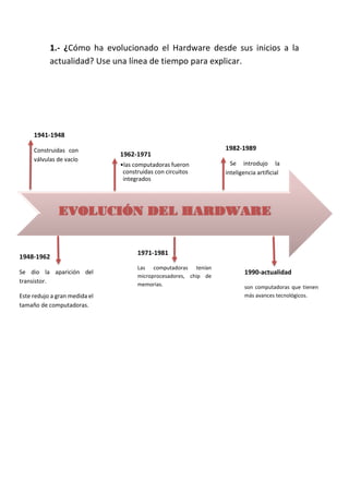 Este documento presenta información sobre la evolución del hardware desde sus inicios hasta la actualidad a través de una línea de tiempo. También define las diferencias y semejanzas entre las memorias RAM y ROM, explica qué es un disco duro e indica sus funciones a través de un organizador visual, y muestra los periféricos de entrada y salida a través de un esquema con texto e imágenes.