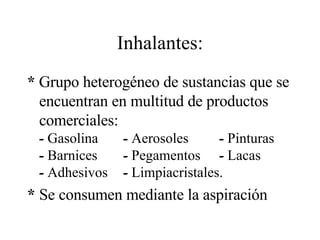 Este documento describe los inhalantes, sustancias que se encuentran en productos comerciales como gasolina, aerosoles, pinturas y pegamentos. Se consumen mediante la aspiración para producir una "borrachera" rápida, especialmente entre adolescentes de niveles socioeconómicos bajos y familias desestructuradas. A dosis altas pueden causar efectos como confusión, apatía y coma, mientras que el consumo crónico puede generar enfermedades orgánicas irreversibles como neuropatía periférica, en