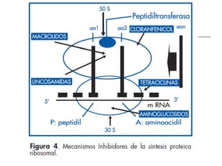 Este documento resume diferentes tipos de antibióticos que inhiben la síntesis de proteínas y la pared celular bacteriana. Describe antibióticos como vancomicina, tetraciclinas, aminoglicósidos como gentamicina, y cloranfenicol, explicando sus mecanismos de acción, espectros, indicaciones y efectos adversos. También menciona otros inhibidores como bacitracina, polimixinas, daptomicina y teicoplanina.
