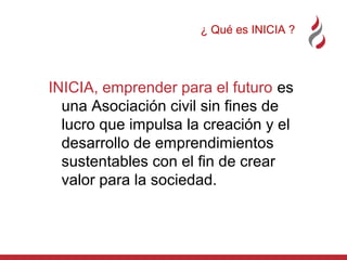 INICIA es una asociación civil sin fines de lucro que impulsa la creación y desarrollo de emprendimientos sustentables a través de capacitaciones y programas de apoyo a emprendedores. Dirige sus esfuerzos a emprendedores, voluntarios, empresas e instituciones con el objetivo de generar valor económico, social, cívico y ambiental. Opera principalmente a través de capacitaciones, encuentros y el desarrollo de redes colaborativas entre sectores.