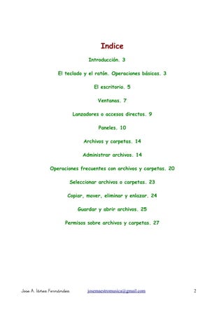 Este documento proporciona una introducción a los conceptos básicos de la interfaz gráfica de usuario de un sistema operativo, incluyendo el escritorio, ventanas, teclado, ratón, archivos, carpetas, y operaciones comunes como copiar y pegar. Explica los elementos del escritorio como paneles, menús y accesos directos. También describe operaciones básicas con el teclado y ratón como atajos de teclado y arrastrar y soltar.