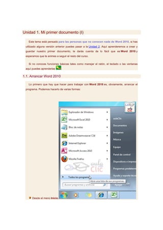 Este documento introduce el programa Microsoft Word 2010 y explica cómo crear y editar un primer documento. Enseña a iniciar Word 2010 desde el menú Inicio o un acceso directo, y cómo escribir texto usando el punto de inserción. También cubre cómo corregir errores usando las teclas Retroceso y Suprimir o moviendo el punto de inserción.
