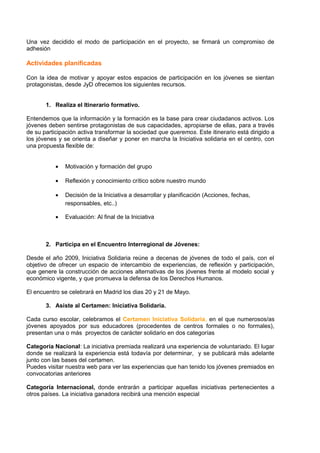 Este documento describe la Iniciativa Solidaria, un proyecto que promueve la participación de jóvenes y educadores en acciones solidarias para crear un mundo más justo. Los jóvenes entre 14 y 20 años pueden participar desarrollando iniciativas solidarias con apoyo de un educador. El proyecto ofrece recursos como un itinerario formativo, un encuentro interregional y un certamen para presentar las iniciativas solidarias.