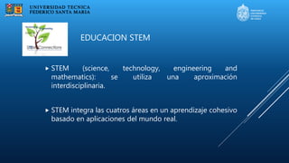 El documento describe iniciativas de educación STEM en una universidad. Propone implementar proyectos interdisciplinarios que integren las áreas de ciencia, tecnología, ingeniería y matemáticas a lo largo de los ciclos formativos de los estudiantes, apoyados por comunidades de investigación docente y con evaluación de impacto. Presenta como ejemplo un proyecto que utiliza una metodología de aprendizaje basado en problemas para diseñar una experiencia integradora STEM en el primer año sobre un problema real de ingeniería como el desastre