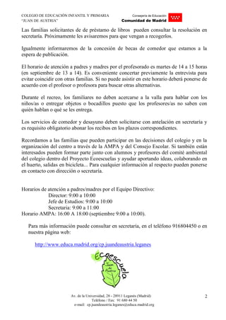 El documento proporciona información sobre las normas y horarios del Colegio de Educación Infantil y Primaria "Juan de Austria" para el inicio del curso 2018/19. Se informa sobre los horarios de entrada y salida, la entrega y recogida de alumnos, la justificación de faltas y retrasos, y las reuniones informativas. También se especifican los horarios de atención a padres, los servicios de comedor y biblioteca, y cómo participar en la AMPA y el Consejo Escolar.