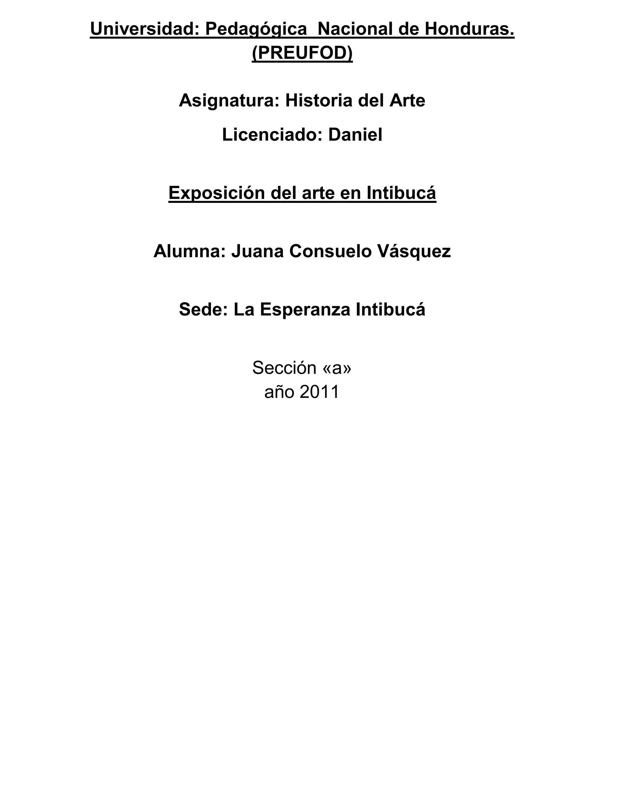 Este documento describe varios aspectos del arte y la cultura del departamento de Intibucá en Honduras. Resume la historia de Intibucá y La Esperanza, destacando sus atractivos turísticos como los baños públicos Quiscamote, el Parque López y su escultura, la Iglesia de Intibucá, la Gruta de la Inmaculada Concepción, la Casa de la Cultura y la laguna de Chiligatoro. También describe la vestimenta, costumbres y artesanía de la etnia Lenca, que pre