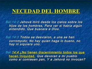 Este documento discute cómo la iniquidad ha arruinado al mundo debido a que todos hemos desobedecido las leyes de Dios, rebelándonos a través de pecados, transgresiones e iniquidades. La iniquidad produce sordera espiritual al alejarnos de Dios, causa enfermedades físicas y dolencias, y la justicia de Dios no obra en medio de la iniquidad. El documento enfatiza la necesidad de arrepentirse de la iniquidad.