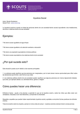 La injusticia social ocurre cuando no todas las personas dentro de una sociedad tienen acceso igualitario a recursos como agua limpia, atención médica, educación o sistemas políticos. Esto puede deberse a la pobreza o a sistemas políticos que tratan a algunos grupos de manera menos digna que a otros. Para combatir la injusticia social, debemos educar a los jóvenes sobre el tema, apoyar a quienes la han experimentado y promover la empatía y la acción positiva.