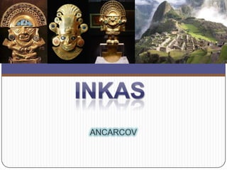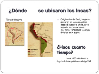 Los incas se ubicaron en la zona andina de Sudamérica hace 1000 años, desde Ecuador hasta Chile. Organizaron un imperio llamado Tahuantinsuyo dividido en cuatro regiones. El inca era la máxima autoridad política y religiosa. La economía se basaba en la agricultura comunitaria y el sistema de tributos. La sociedad estaba jerarquizada con el inca y la nobleza en la cima.