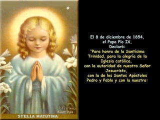 El Papa Pío IX declaró en 1854 el dogma de la Inmaculada Concepción, afirmando que María, madre de Jesús, fue preservada de toda mancha de pecado original desde el primer instante de su concepción. Este dogma sostiene que María, a diferencia de todos los demás seres humanos, no heredó el pecado original sino que estuvo libre de pecado desde el momento en que fue concebida. La Iglesia Católica enseña que Dios preservó a María de esta manera en atención a que iba a ser la madre de