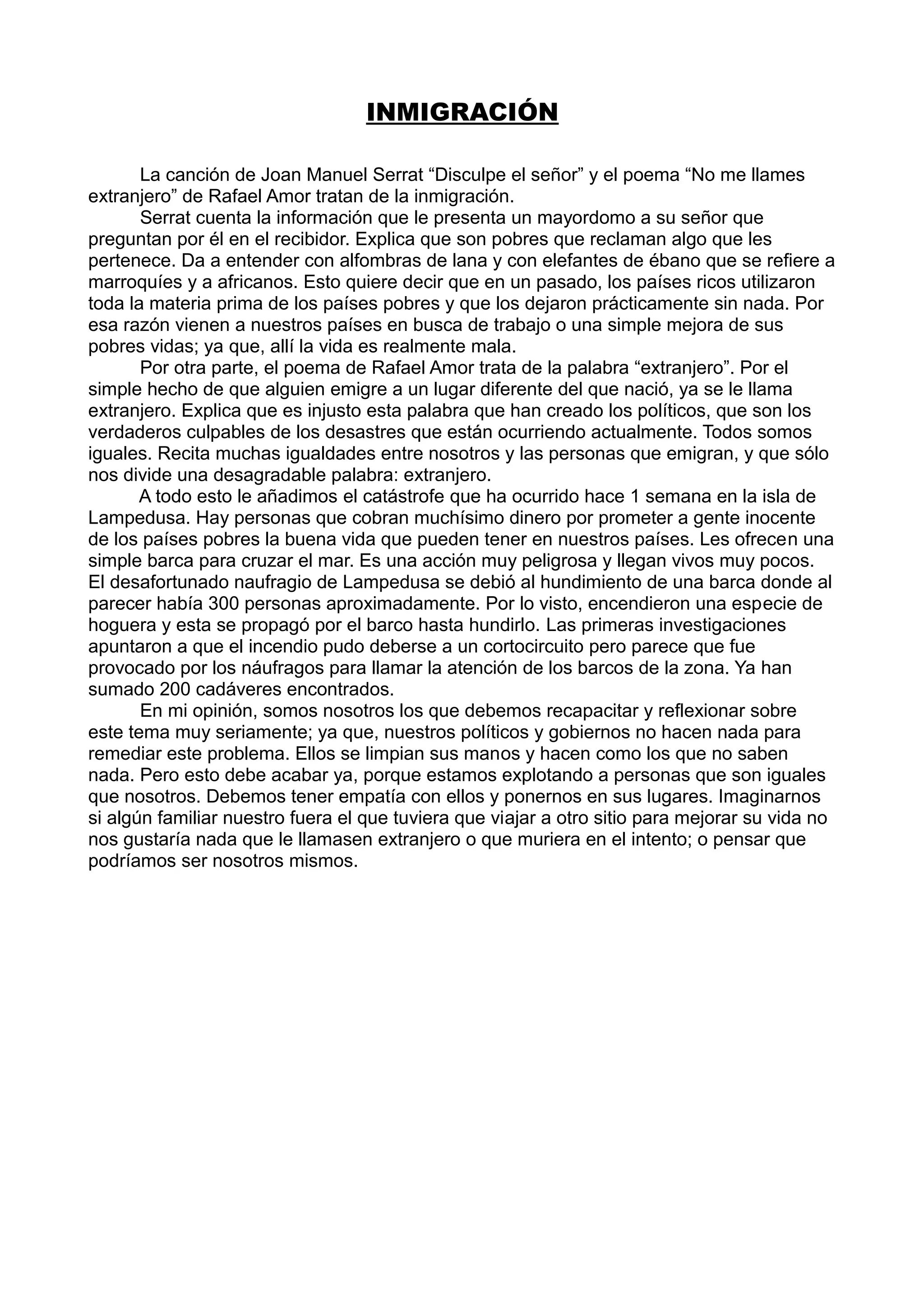 El documento trata sobre la inmigración a través de la canción "Disculpe el señor" de Joan Manuel Serrat y el poema "No me llames extranjero" de Rafael Amor. Ambos describen las dificultades de los inmigrantes y critican el término "extranjero". También menciona el naufragio reciente en Lampedusa donde murieron 200 personas que intentaban cruzar el mar en una barca peligrosa con la promesa de una mejor vida.
