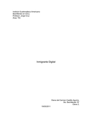 Este documento discute el concepto de "inmigrante digital", refiriéndose a personas nacidas antes de 1990 que se han adaptado tardíamente a las tecnologías de la información y la comunicación. Explica que los inmigrantes digitales aprenden las TIC de manera diferente a los nativos digitales y mantienen cierta conexión con el pasado pre-digital. También enumera algunas características comunes de los inmigrantes digitales como seguir instrucciones paso a paso y aprender basándose en conocimientos previos.
