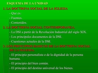 La Doctrina Social de la Iglesia trata sobre la moralidad de las acciones sociales y políticas a la luz de la revelación cristiana. Sus principios se basan en las enseñanzas de Jesucristo y los Papas y Obispos a lo largo de la historia. La DSI ha ido ampliando su alcance para abordar problemas contemporáneos como la justicia económica internacional, el desarrollo sostenible y los derechos humanos. Sus principios fundamentales incluyen la dignidad de la persona, el bien común, la destinación