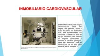 El documento describe varios equipos e instrumentos necesarios para una cirugía cardiovascular. Incluye una sala quirúrgica con características especiales, una mesa quirúrgica ajustable, lámparas quirúrgicas, desfibrilador, bombas de infusión, electrocauterio, monitor cardiaco, y otros dispositivos para asistir al paciente durante el procedimiento.