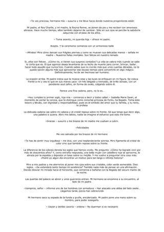 El documento es un extracto de una historia de ficción que narra la vida de una princesa inmortal llamada Isabella. En su primer siglo de vida, Isabella asiste a una celebración en su honor donde recibe una corona que la distingue como princesa inmortal. Sin embargo, Isabella se siente sola y aterrorizada por la perspectiva de vivir para siempre. Más tarde, vampiros atacan una aldea cercana y los guardias salen a cazarlos, recordando la enemistad entre vampiros e inmortales.