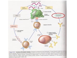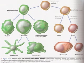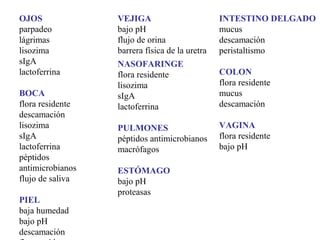 El documento describe los diferentes mecanismos de inmunidad innata y adquirida del cuerpo. La inmunidad innata incluye barreras físicas y químicas, así como células y moléculas que combaten infecciones de manera no específica. La inmunidad adquirida es mediada por linfocitos B y T que reconocen de manera específica a patógenos. Los linfocitos T ayudan a activar linfocitos B para producir anticuerpos contra antígenos específicos.