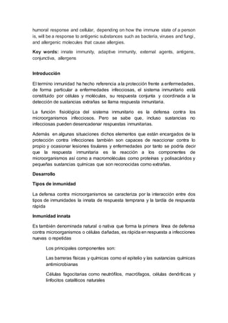 La inmunidad es un sistema complejo que defiende al organismo de agentes externos mediante dos tipos principales: la inmunidad innata, que es la primera línea de defensa, y la inmunidad adaptativa, que se desarrolla tras la exposición a antígenos. Ambas inmunidades interactúan para crear respuestas efectivas contra microorganismos y alérgenos, siendo la memoria inmunitaria crucial para combatir infecciones repetidas. Las alergias, como reacciones exageradas del sistema inmunitario, son desencadenadas por alérgenos comunes y pueden llevar a diversas manifestaciones clínicas, desde conjuntivitis hasta anafilaxia.