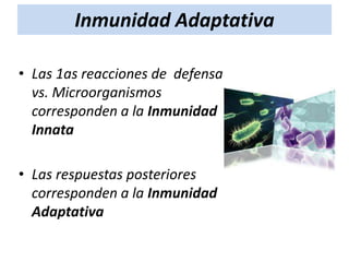 El documento describe la inmunidad adaptativa. Se caracteriza por su exquisita especificidad para diversas moléculas, su capacidad de recordar exposiciones anteriores al mismo antígeno, y su habilidad para reconocer una gran cantidad de sustancias microbianas y no microbianas. La inmunidad adaptativa se inicia con el reconocimiento de determinantes antigénicos por parte de linfocitos T y B, lo que conduce a la activación y proliferación de estas células y la generación de células de memoria que regulan respuestas secund
