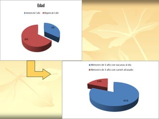 El documento analiza los esquemas de vacunación de 154 pacientes pediátricos. Muestra que el 91% de las vacunas aplicadas correspondían al Programa Ampliado de Inmunizaciones, mientras que solo el 9% eran vacunas opcionales. El 57% de los vacunados tenían menos de 18 meses. El 12% en general y el 19% de los menores de un año tenían esquemas atrasados de vacunación.