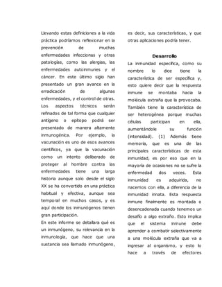El documento describe la diferencia entre antígenos e inmunógenos. Un antígeno es una sustancia extraña que puede ser reconocida por el sistema inmune, pero no necesariamente induce una respuesta inmune. Un inmunógeno es capaz de inducir específicamente una respuesta inmune al ser reconocido por linfocitos a través de características como su tamaño molecular y composición química. Los inmunógenos son necesarios para la generación de vacunas y juegan un papel clave en la prevención de enfermed