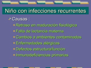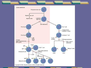 El documento trata sobre las inmunodeficiencias primarias. Explica que pueden ser de predominio humoral, celular, fagocítico o asociado al complemento. Describe varios tipos como la agammaglobulinemia, deficiencia de IgA, enfermedad de Bruton e inmunodeficiencia combinada severa. También cubre datos de alarma, estudios iniciales y avanzados para cada tipo, y formas de tratamiento como gammaglobulina e transplante de médula ósea.