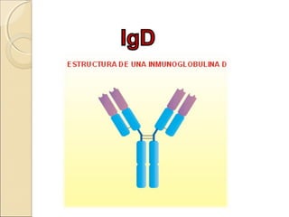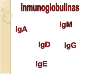 Este documento describe las inmunoglobulinas, proteínas producidas por los linfocitos B en respuesta a antígenos. Se explica que son glicoproteínas que reconocen y unen antígenos como proteínas, polisacáridos y lípidos. También se detallan algunas de sus funciones como la activación del sistema del complemento y la opsonización de microorganismos. Finalmente, se exponen aplicaciones médicas como el diagnóstico de enfermedades a través de pruebas serológicas y el tratamiento