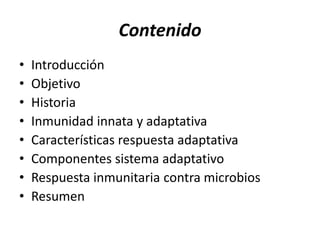 Este documento resume los conceptos fundamentales de la inmunología, incluyendo la diferencia entre la inmunidad innata y adaptativa, las características y componentes del sistema inmunitario adaptativo, y las fases de la respuesta inmunitaria adaptativa como el reconocimiento de antígenos, la activación linfocitaria y la eliminación de antígenos. El documento también resume brevemente la historia de la inmunología y los descubrimientos clave en el campo.
