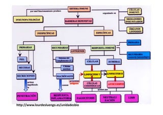 Este documento presenta información sobre inmunología para estudiantes de segundo año de bachillerato. Explica conceptos básicos del sistema inmunitario como células, órganos y procesos involucrados en la defensa del organismo contra agentes extraños. También incluye enlaces a sitios web adicionales con más detalles sobre el tema.
