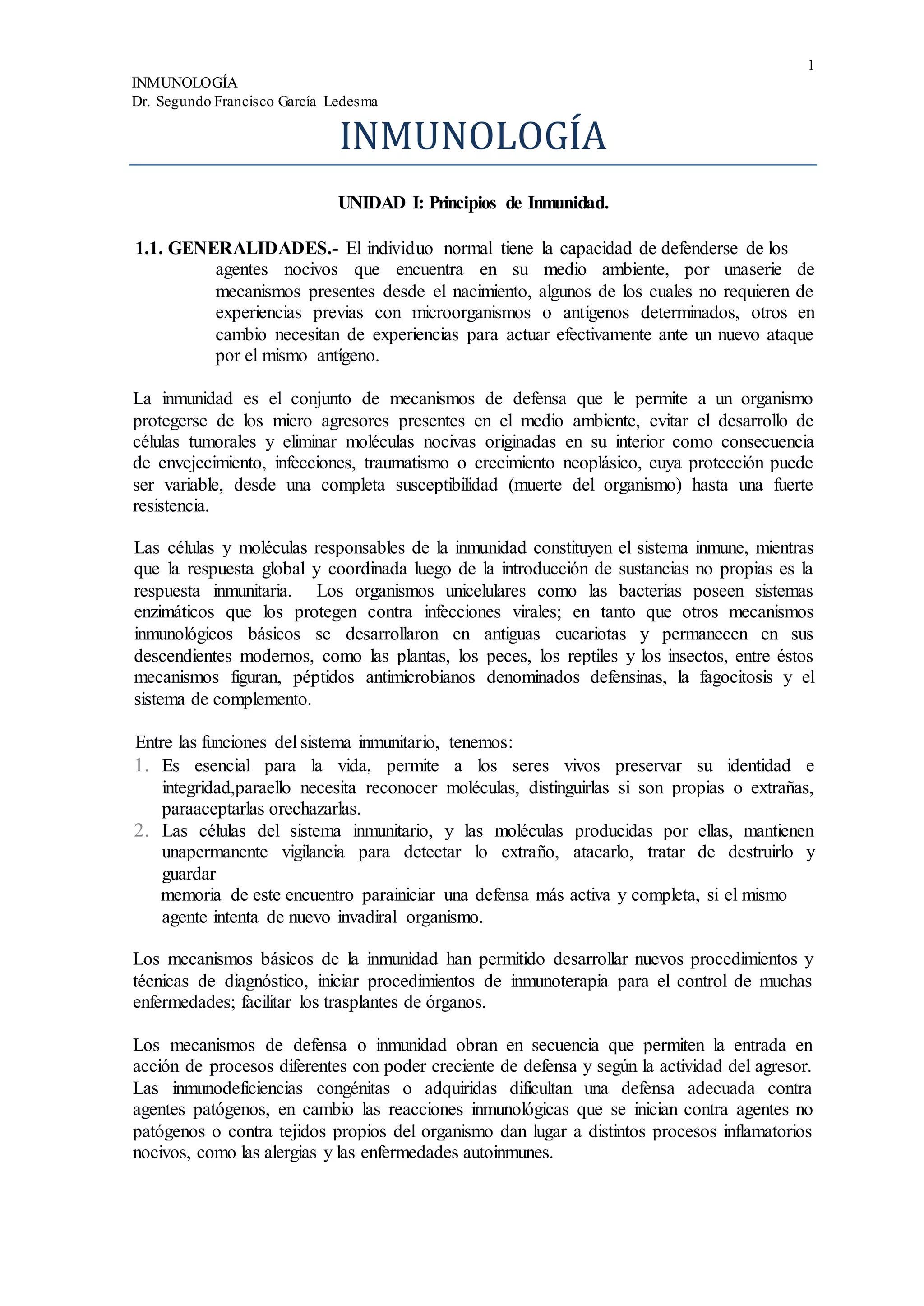 Este documento presenta una introducción general a la inmunología. Explica que el sistema inmunológico está compuesto por mecanismos de defensa innatos y adquiridos que protegen al organismo de agentes nocivos. Describe las principales células y moléculas involucradas, incluyendo linfocitos, macrófagos y citoquinas. También distingue entre la inmunidad innata general y la inmunidad adquirida específica mediada por linfocitos.
