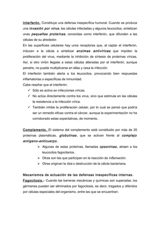 Este documento describe los mecanismos de defensa del sistema inmunológico. Primero, explica las defensas inespecíficas externas e internas como la piel, mucosas, glóbulos blancos y fagocitosis. Luego, describe las defensas específicas como los linfocitos B y T, anticuerpos, memoria inmunológica y reconocimiento de lo propio frente a lo extraño. Finalmente, resume los orígenes y tipos de células que participan en la respuesta inmune como linfocitos,