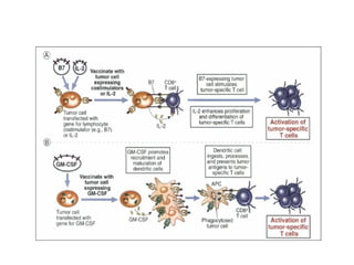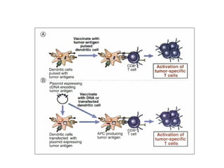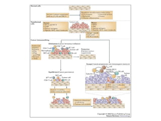 Este documento resume los conceptos fundamentales de la inmunología del cáncer. Explica que los tumores expresan antígenos que pueden ser reconocidos por el sistema inmunitario, pero que las respuestas inmunitarias no siempre pueden evitar el crecimiento del tumor. Describe los mecanismos de eliminación, equilibrio y escape del tumor, así como los diferentes tipos de células y moléculas involucradas en las respuestas inmunitarias contra el cáncer, incluyendo linfocitos T, anticuerpos, linfocitos