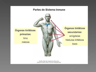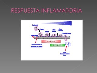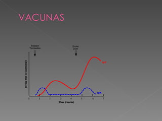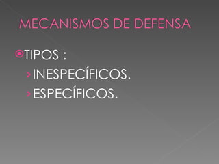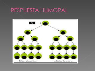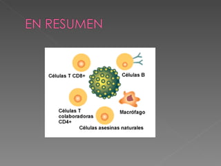 El documento describe los mecanismos de la inmunidad innata y adaptativa. La inmunidad innata incluye barreras externas como la piel y barreras internas como células y biomoléculas. Las células incluyen glóbulos blancos que fagocitan patógenos y liberan sustancias inflamatorias. Las biomoléculas incluyen el complemento e interferón. La inmunidad adaptativa la median los linfocitos B y T. Los linfocitos B producen anticuerpos mientras que los linfocitos T reconocen