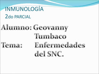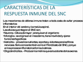 El documento describe los mecanismos inmunológicos del sistema nervioso central para evitar procesos inflamatorios. Incluye una barrera hematoencefálica, vigilancia inmunológica del líquido cefalorraquídeo, y acceso controlado de células inmunes solo cuando hay trauma u otros insultos al cerebro para iniciar una respuesta local sin dañar el tejido nervioso.