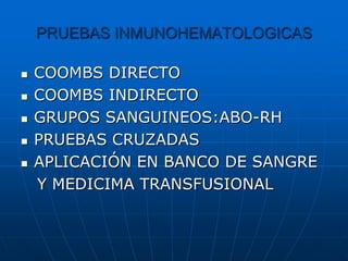Este documento resume los principales conceptos de inmunohamatología, incluyendo pruebas inmunológicas como Coombs directo e indirecto, grupos sanguíneos ABO y Rh, pruebas cruzadas y su aplicación en bancos de sangre. También describe los componentes sanguíneos como glóbulos rojos, plasma fresco congelado, crioprecipitado y plaquetas que pueden extraerse de una unidad de sangre donada.