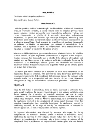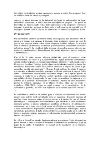 El documento trata sobre la tolerancia inmune. Resume los principales descubrimientos en el campo desde los estudios pioneros de Born y Medawar hasta investigaciones recientes. Explica que la tolerancia inmune permite al sistema inmune distinguir entre lo propio y lo extraño, tolerando los antígenos propios. Se ha avanzado en comprender los mecanismos de tolerancia central y periférica mediados por linfocitos T y células dendríticas tolerogénicas.