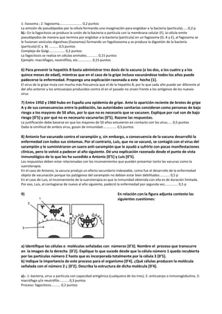 Este documento presenta 15 preguntas sobre inmunología para un examen de biología. Incluye definiciones de términos como autoinmunidad, hipersensibilidad e inmunodeficiencia. Explica procesos como la vacunación y la sueroterapia, y diferencia entre ellos. También describe procesos inmunológicos como la fagocitosis y la respuesta inflamatoria, e identifica las células y moléculas involucradas en ellos. Finalmente, explica conceptos como la memoria inmunológica y la trans