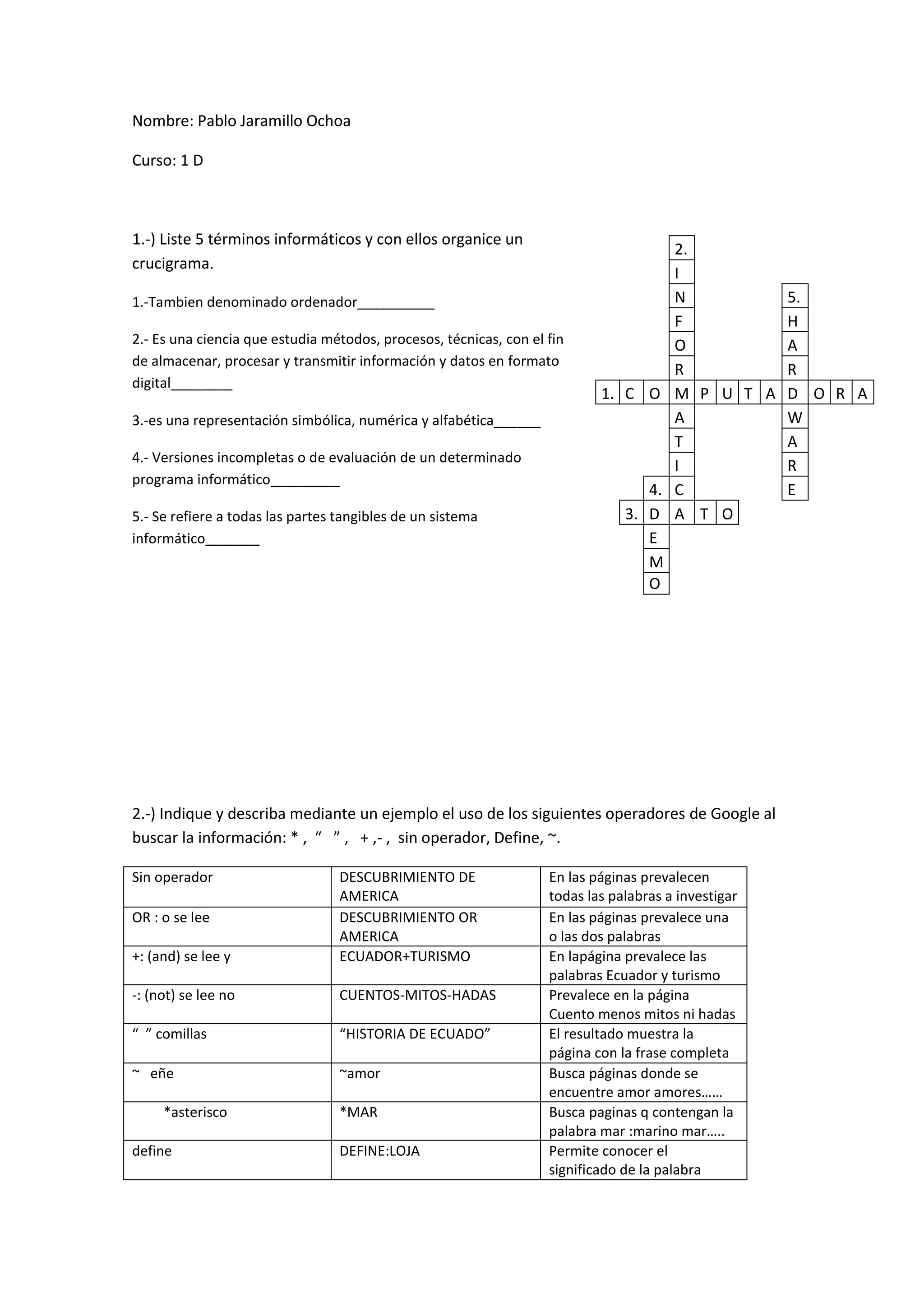 El documento proporciona información sobre términos informáticos y estrategias de evaluación de información. Incluye una lista de 5 términos informáticos con sus definiciones en forma de crucigrama, y describe estrategias como verificar la autoridad, credenciales, imparcialidad y vigencia de la fuente de información. También enumera herramientas comunes de Web 2.0 como YouTube, Wikipedia y Flickr.