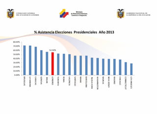 El documento resume los resultados de la gestión de la Embajada de Ecuador en el Reino Unido entre 2010 y 2013. Se destaca el posicionamiento de la imagen de Ecuador y sus instituciones, así como el fortalecimiento de las relaciones bilaterales entre los dos países. También se resaltan las actividades realizadas por la Oficina Comercial para promover el comercio y las inversiones, y el trabajo del Consulado y SENAMI para brindar servicios y apoyo a la comunidad ecuatoriana en el Reino Unido.