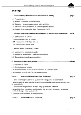 Este documento describe el trabajo de un grupo sobre la eficiencia energética de edificios residenciales. El objetivo es comparar y cuantificar la eficiencia de la generación y gestión energética centralizada frente a la alternativa individual en viviendas. El grupo estudiará una muestra de 90 viviendas, analizando solo los sistemas energéticos y asumiendo condiciones estándar. El objetivo principal es determinar si existe ahorro energético con la centralización y cuantificarlo. La Unión Europea está impulsando mejoras en la eficiencia energé