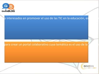 Aulablog es un proyecto impulsado por un grupo de profesores de España interesados en promover el uso de las TIC en la educación, especialmente herramientas de la Web Educativa 2.0. El proyecto comenzó en enero de 2005 y desde entonces han trabajado en crear un portal colaborativo sobre el uso de la tecnología digital en el aula, centrándose en el uso educativo de los blogs.