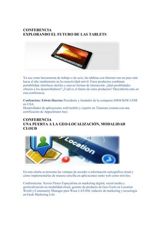 Este documento describe varios talleres y conferencias sobre desarrollo de software que se llevarán a cabo en Campus Party. Los temas incluyen desarrollo para dispositivos móviles, tabletas, geolocalización, videojuegos, Ruby on Rails, Titanium y más. Expertos en cada área presentarán sobre tendencias, herramientas y cómo aprovechar las nuevas tecnologías.