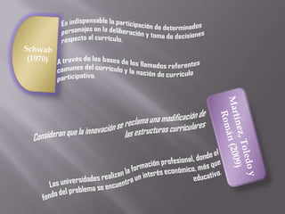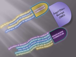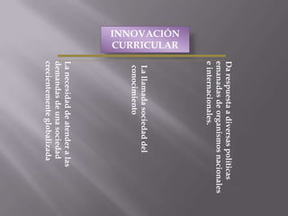 Este documento habla sobre la innovación curricular en respuesta a demandas sociales y políticas. Propone incorporar tecnologías de la información, enfocarse en el aprendizaje por proyectos y problemas reales, y centrarse en el aprendizaje del estudiante basado en principios constructivistas. También sugiere que el currículo sea flexible y contribuya a la formación por competencias, considerando el proceso del docente para incorporar nuevos modelos educativos.