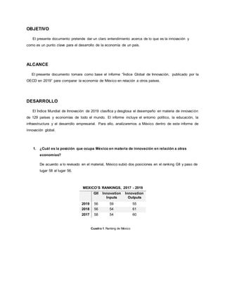 Este documento resume un análisis del Índice Global de Innovación 2019 de la OECD para comparar la posición de México frente a otras economías. Identifica cinco áreas clave para que México se centre como la sofisticación empresarial, conocimientos tecnológicos, sofisticación del mercado, productos creativos y capital humano e investigación. Aunque México ha mejorado su ranking, todavía necesita invertir más en educación, ciencia y tecnología para crear un verdadero ecosistema de innovación.