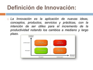 Este documento define e ilustra la innovación radical e incremental. La innovación radical implica un cambio completo con un nuevo producto o proceso, como el cambio de los caballos a los motores. La innovación incremental implica mejoras menores a productos existentes, como agregar airbags a los autos. La innovación radical puede crear nuevos mercados pero requiere más tiempo de investigación, mientras que la incremental conlleva menos riesgo pero también menores beneficios económicos. Las empresas deben innovar para ganar ventajas competitivas.