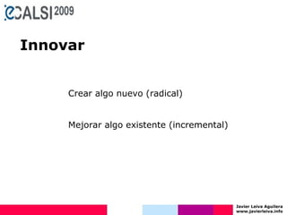 El documento habla sobre la innovación. Explica que la innovación puede aplicarse a modelos de negocio, procesos, productos y más. Señala que la innovación debe estar alineada con la estrategia de la empresa y que a menudo implica aplicar tecnologías existentes a nuevos problemas. También propone adoptar un enfoque de innovación abierta que aproveche ideas de fuera de la empresa y comparte conocimientos. Finalmente, enfatiza que la innovación debe ser parte de la cultura corporativa y que las empresas deben cambiar su actitud para mantener