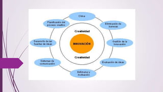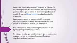 El documento define la innovación como la introducción de nuevas ideas o inventos al mercado o a las prácticas de negocio. Explica que la innovación implica mayor riesgo cuanto más novedoso sea el producto o servicio. Además, señala que para determinar qué tan innovador es un proyecto, se considera qué tan diferente es respecto a lo existente y cuán seguros son los resultados esperados.