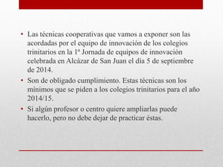 Este documento presenta las técnicas cooperativas acordadas por el equipo de innovación de los colegios trinitarios para el año escolar 2014/15. Describe cuatro técnicas principales - 1-2-4, Lápices al centro, Folio giratorio y El saco de las dudas - que los profesores deben practicar para fomentar el aprendizaje cooperativo. También menciona dos técnicas adicionales llamadas "La sustancia" y "Paradas de tres minutos".