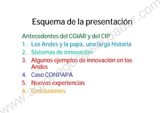 Este documento describe varios ejemplos de innovación en la papa en los Andes, incluyendo el desarrollo de nuevas variedades, campañas de promoción, y el caso de CONPAPA en Ecuador. CONPAPA es una plataforma que conecta productores de papa con el mercado de comida rápida a través de capacitación, desarrollo de nuevas variedades como la papa fripapa, y mejorando prácticas de producción y poscosecha. El documento también discute los sistemas de innovación y la importancia de la papa